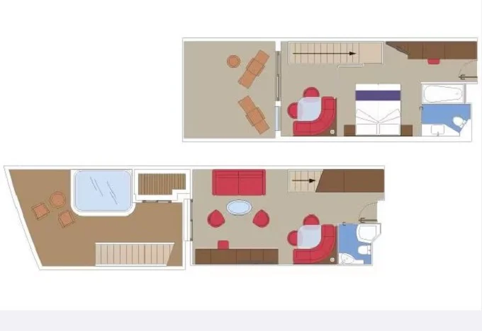 | YJD - Yacht Club Duplex Suite s vírivkou 46 m² + balkón 30 m². Vírivka. 2 podlažia, šatník, 2 kúpeľne (1 s vaňou). Max 4 osoby. 16. paluba. Cenový model MSC Yacht Club. Easy package v cene | 10 230 € 10 230 € za osobu | ||