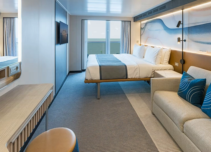 SI - Suite s veľkým balkónom na korme 24 m² / balkón 19 m². 9. paluba - vzadu. Max 2 osoby. Výhody Suite. 8 434 € 4 217 € za osobu
